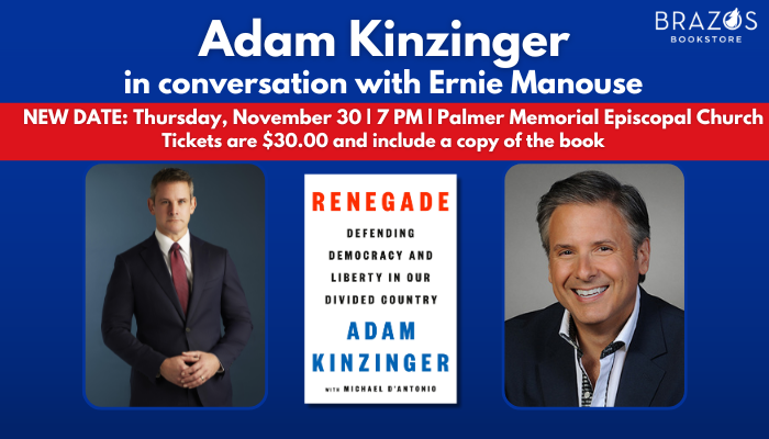 For more information or to order books, please visit: https://www.brazosbookstore.com/rescheduled-adam-kinzinger-renegade-defending-democracy-and-liberty-our-divided-country