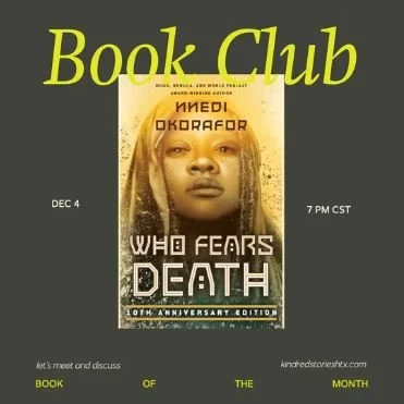 For more information or to order books, please visit: https://kindredstorieshtx.com/collections/book-clubs/products/november-2023-adult-book-club-who-fears-death-november-30-7-pm