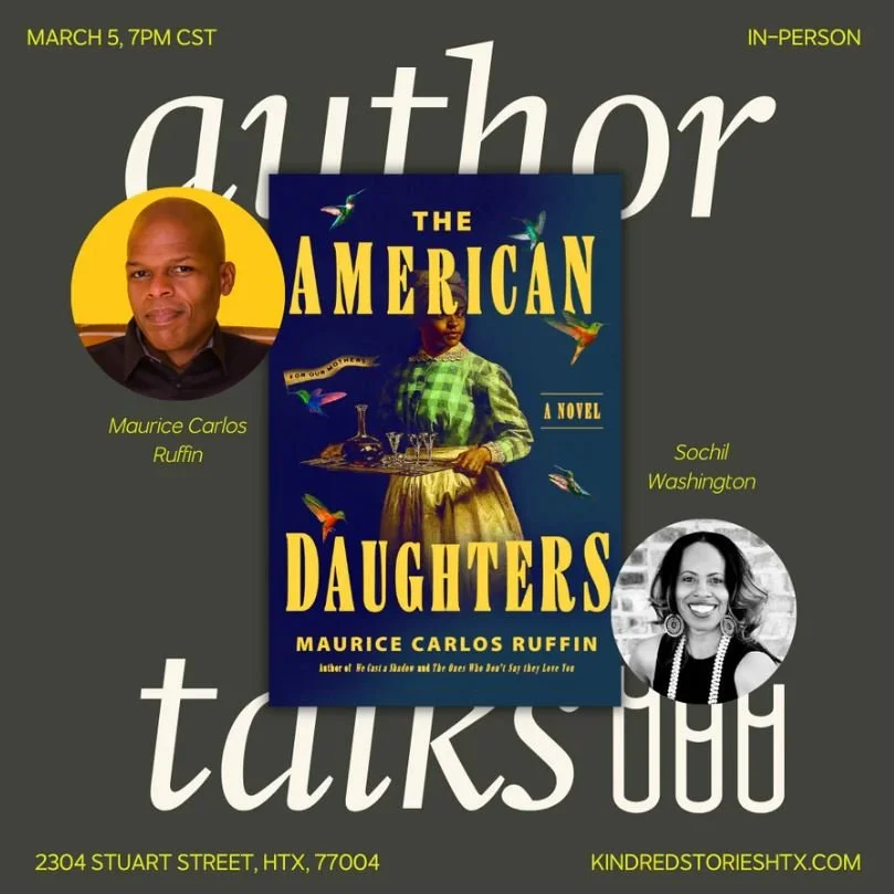 For more information or to order books, please visit: https://kindredstorieshtx.com/products/irl-author-talk-the-american-daughters-with-maurice-carlos-ruffin-march-5-7pm