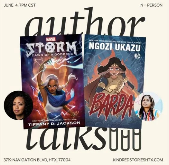 For more information or to order books, please visit: https://kindredstorieshtx.com/products/irl-author-talk-storm-goddess-of-dawn-and-barda-with-tiffany-d-jackson-ngozi-ukazu-june-4-7pm