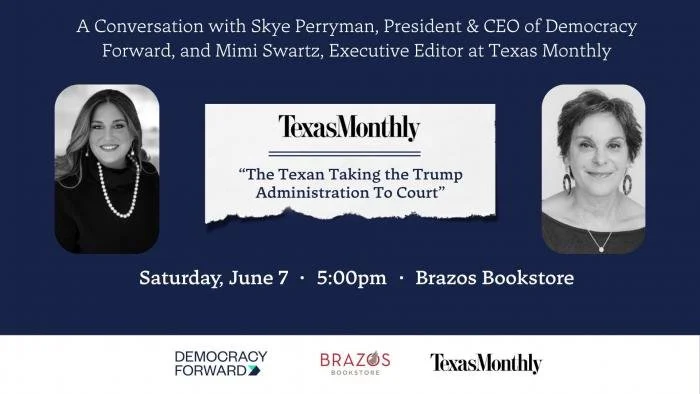 Please join us on June 7th from 5pm-6pm for Coffee for Change: A Conversation with Skye Perryman, President & CEO of Democracy Forward, and Mimi Swartz, Executive Editor at Texas Monthly discussing Democracy Forward’s legal efforts to protect people and democracy. Light refreshments will be provided.